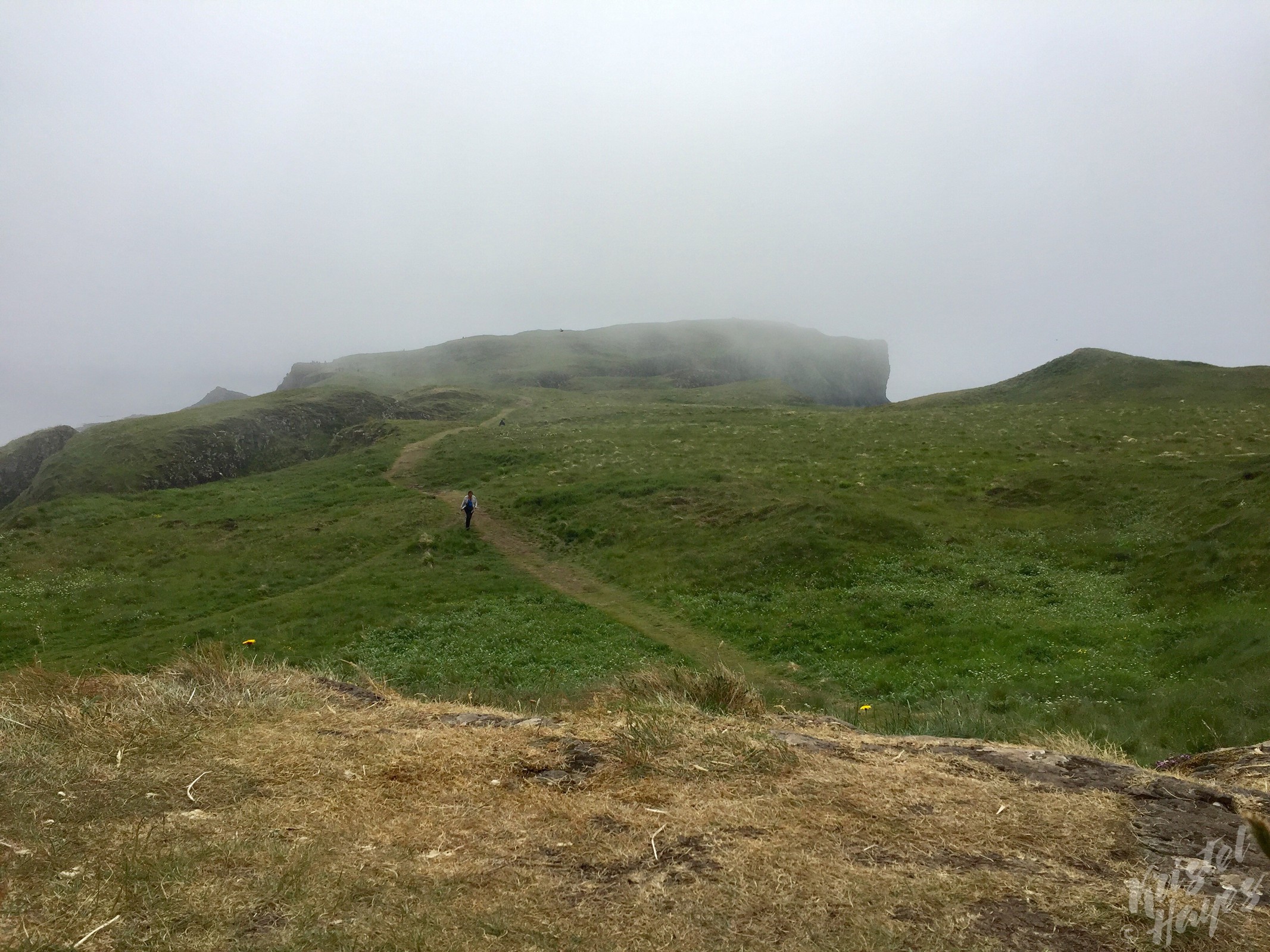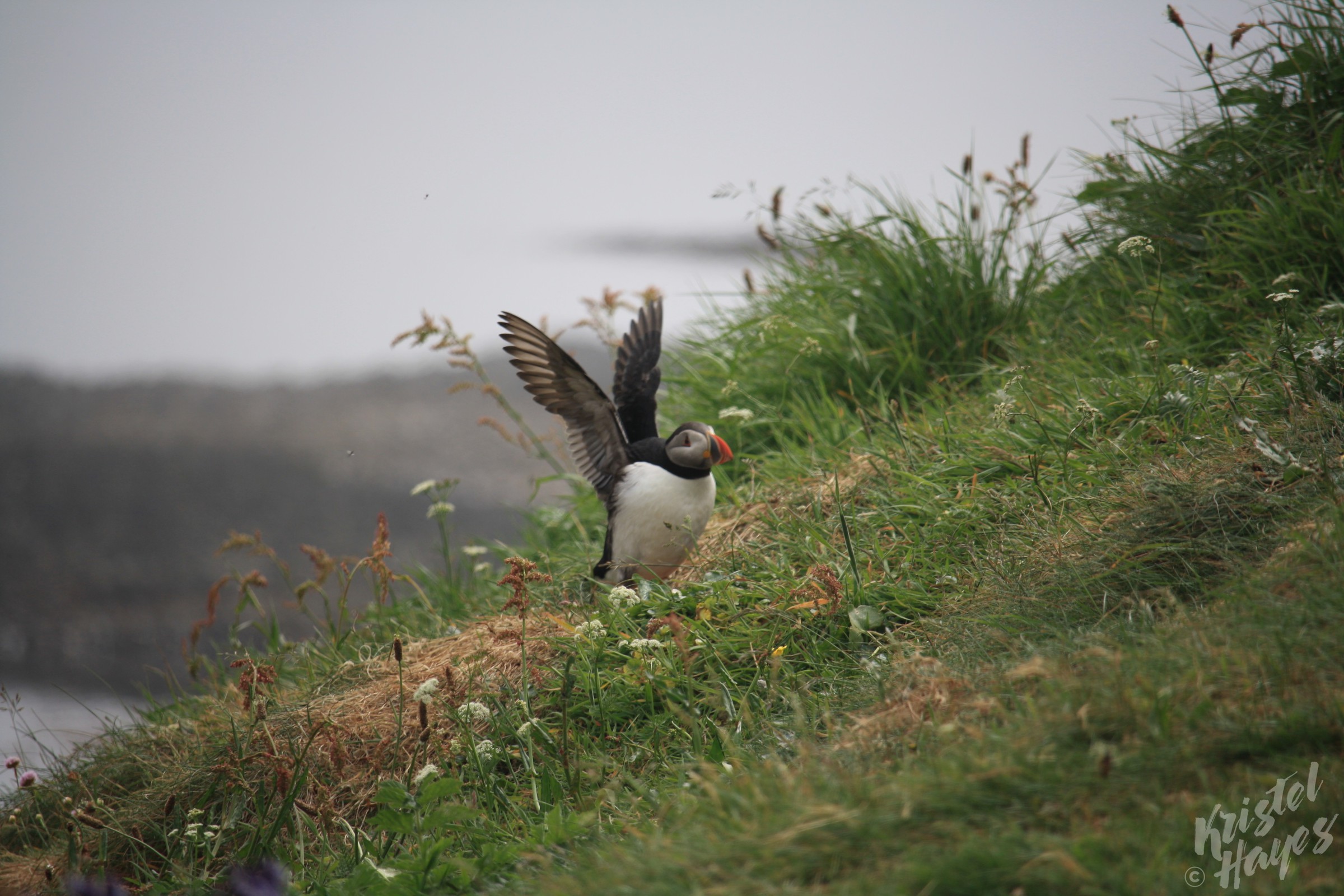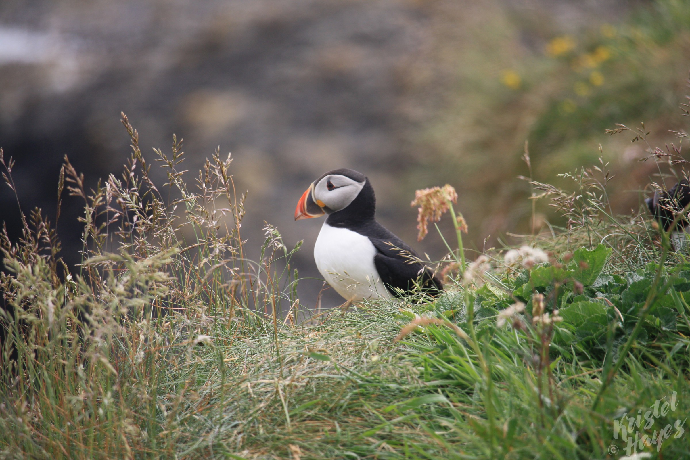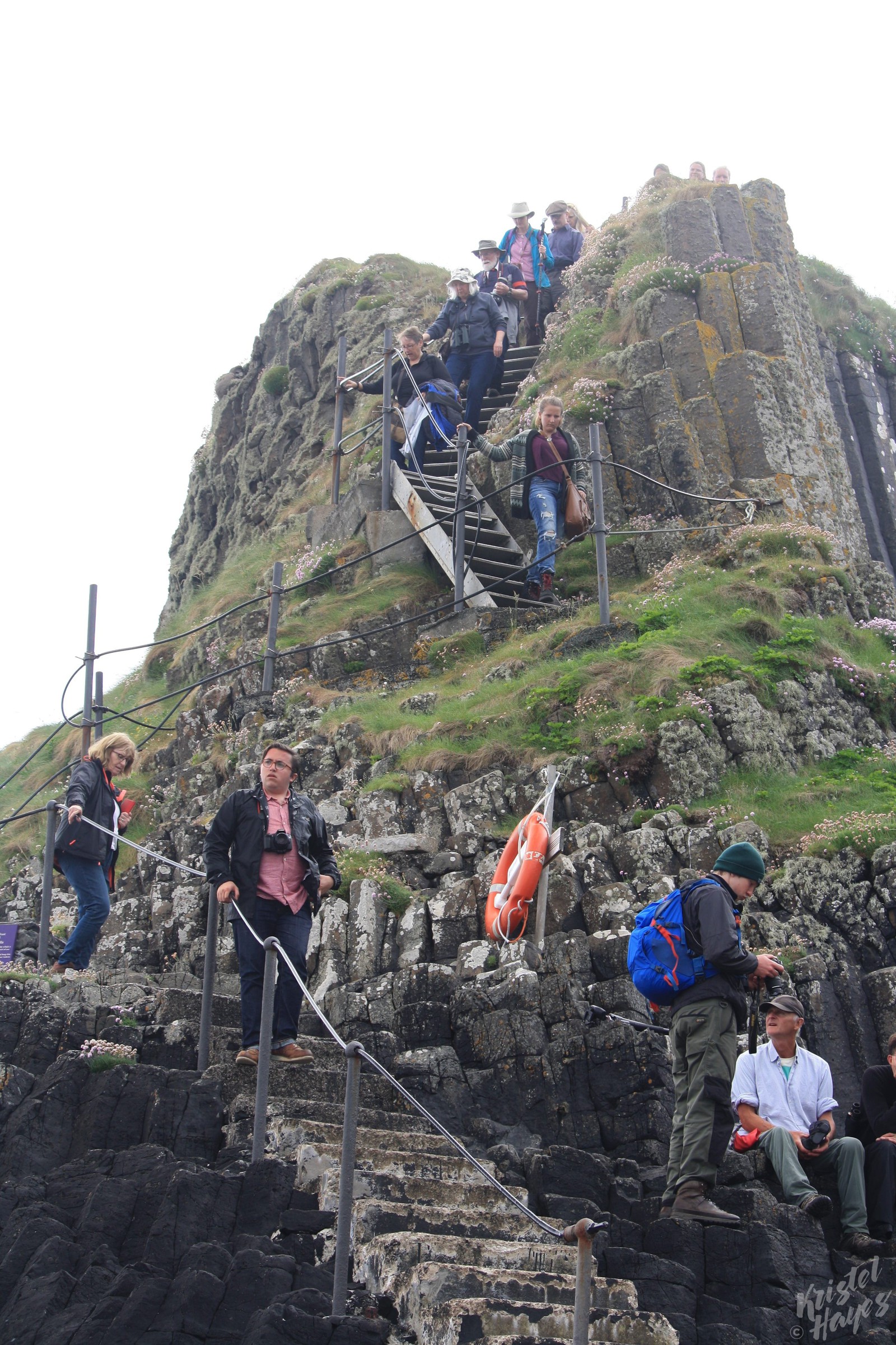 Upon landing, for those of us who wanted to see Puffins, we were instructed to climb a steep staircase (just steps from the boat) then to walk along the top of the ridge until we saw the marker indicating we were at the viewing point. From there, we were told, the Puffins should simply start to appear.